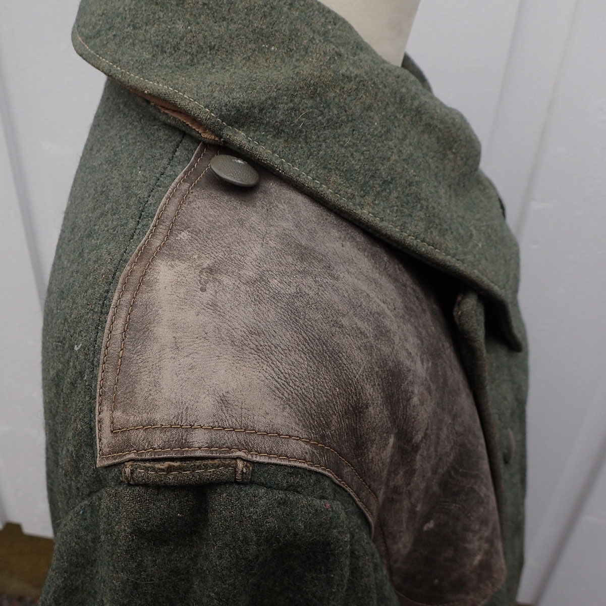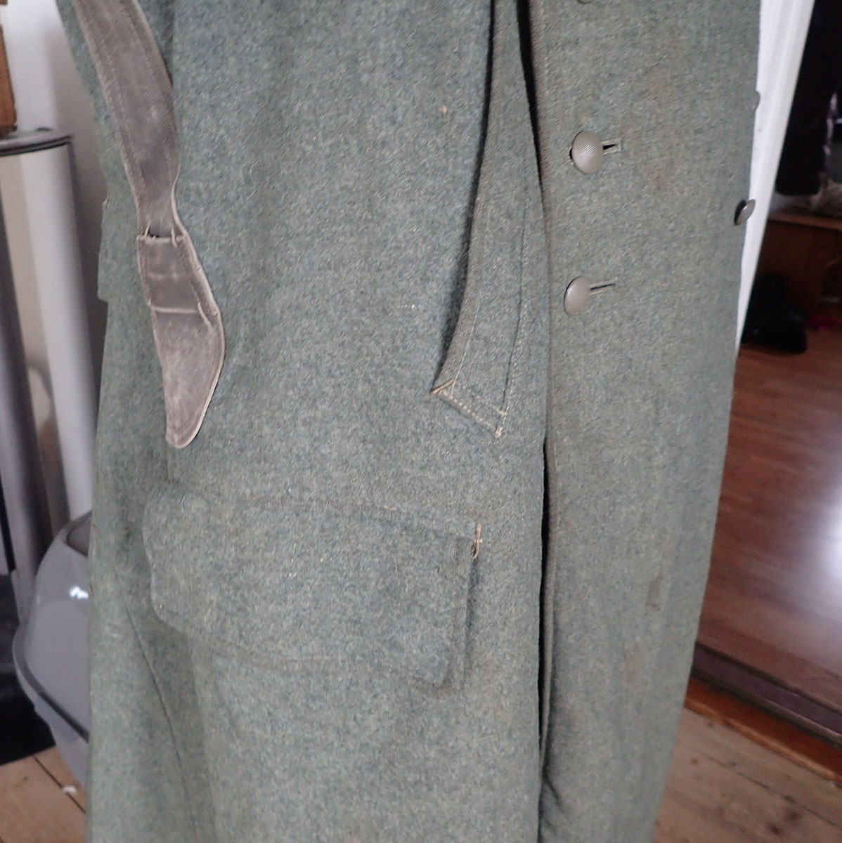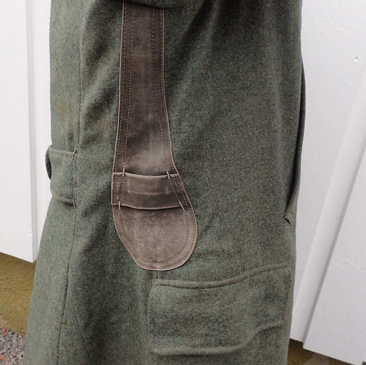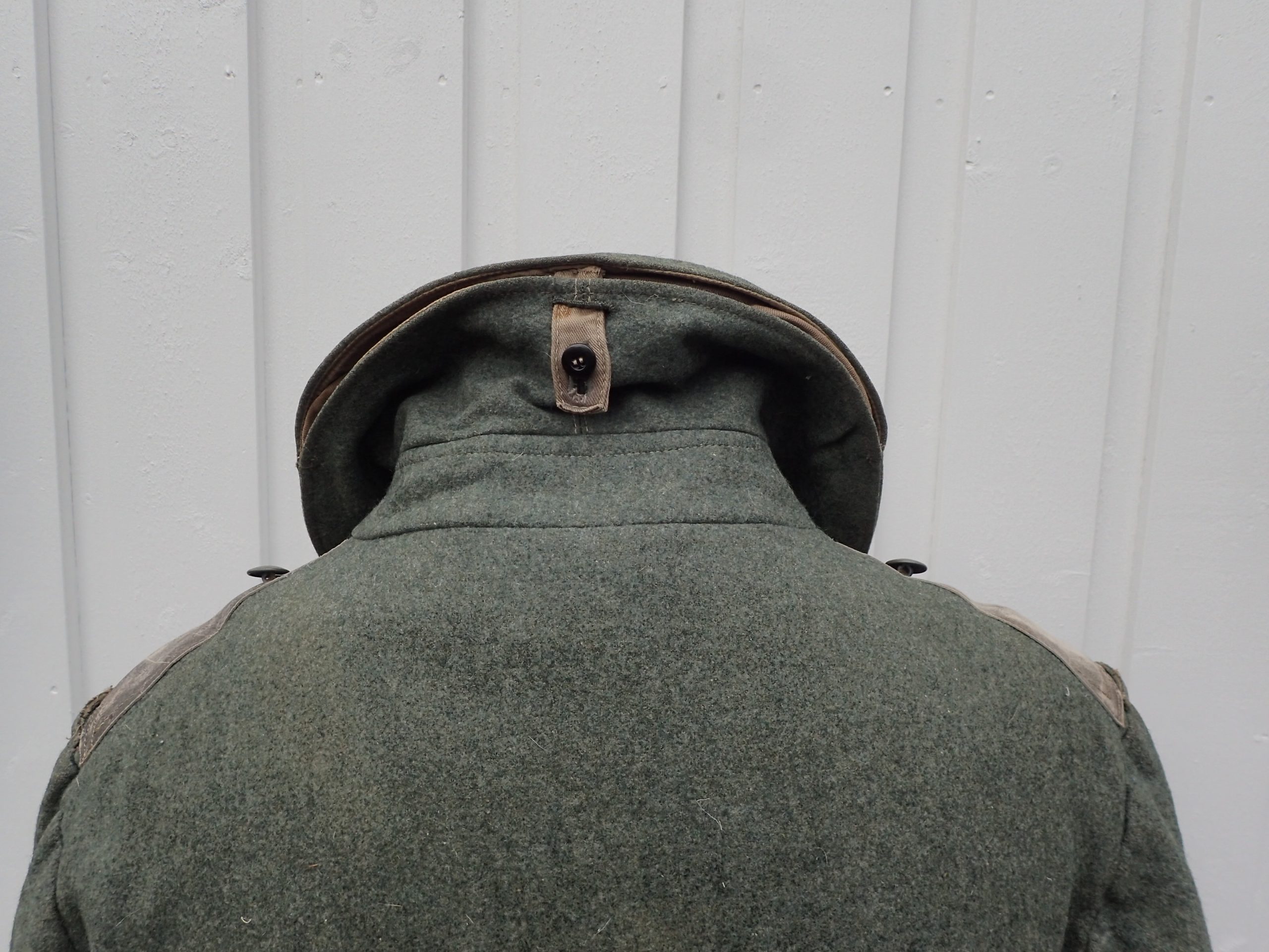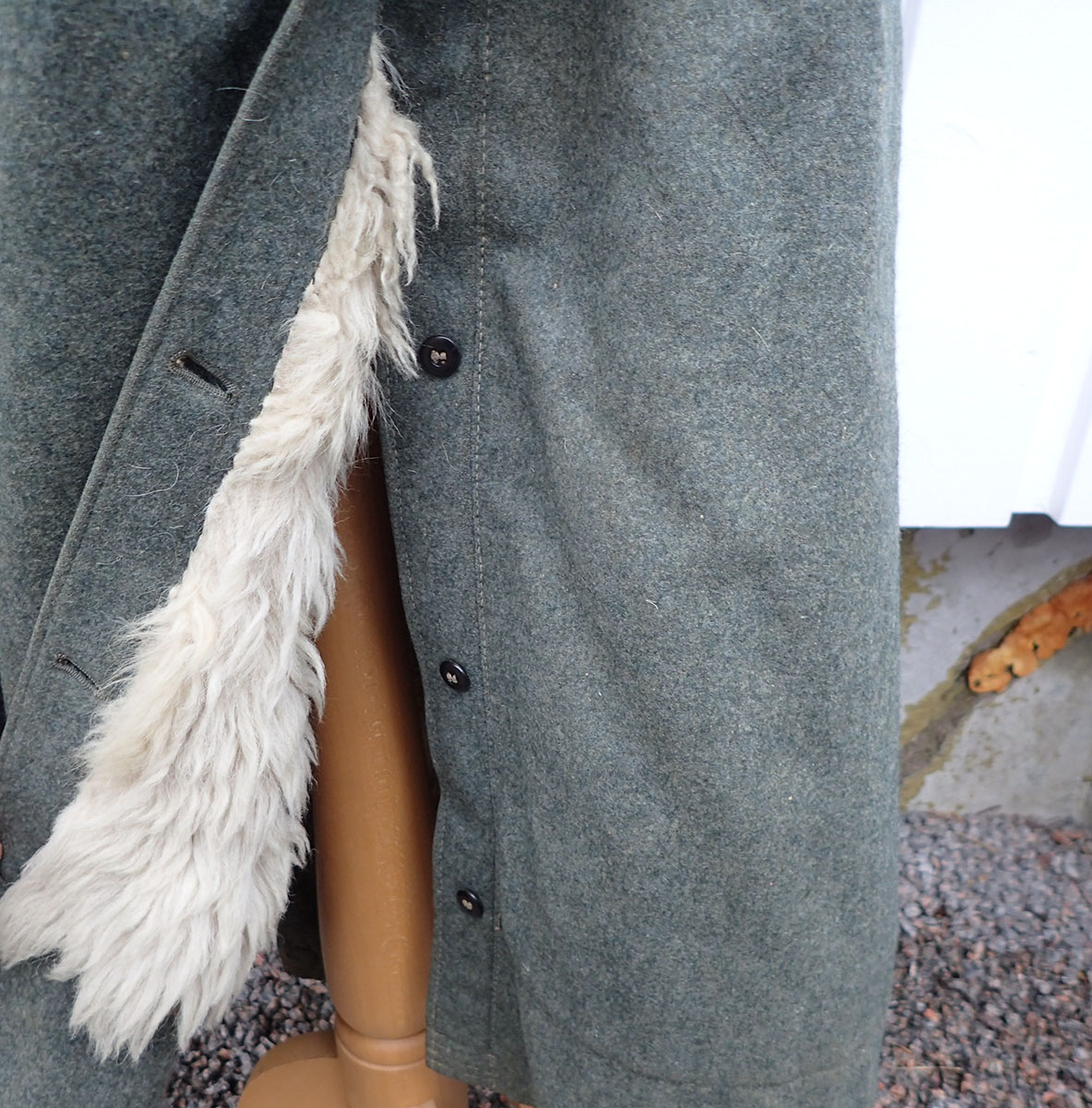 Wehrmacht/SS vaktfrakk. Sydd i grønn uniformsstoff. I fronten 12 grønnlakkerte knapper. Oppå skuldrene knapper og hemper, for å knappe på Wehrmacht eller Waffen-SS skulderklaffer. I halsen hempe i metall, for å knepper igjen halsen. Under kraven tunge og knapper, for å kneppe igjen halsen. Bak i kraven hette i beige bomull. Denne er festet med hempe med knapp. Bak på frakken er det en strammehempe med 2 knapper. Foran er det skråstilt stikklomme og vannrette lommer med lommeflapper. Oppå skuldrene er det tykk grå skinn, hvor mauserreimen skal henges over, slik at mauseren med reimen ikke gnager på skuldrene. Under armene samme grå tykk lær, hvor mauserbajonetten skal festes ned i. Fordi man ikke får brukt ett vanlig belte rundt en slik tykk frakk som denne, så skal mauserbajonetten festes under en av armene. Bak i folden alle de originale små knappene.
