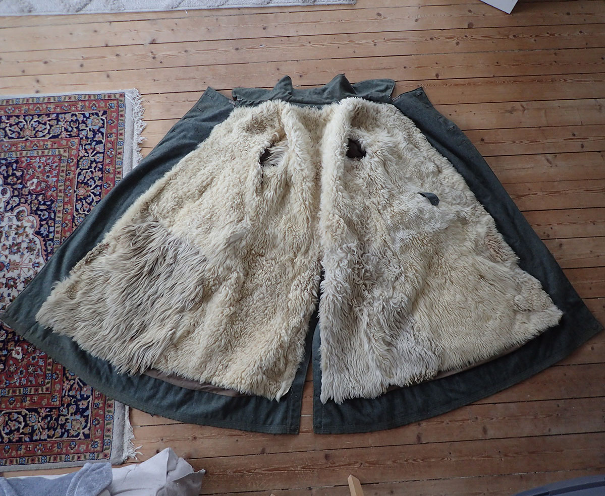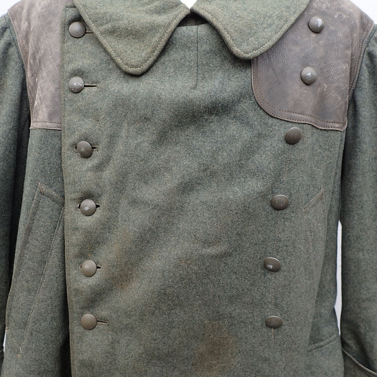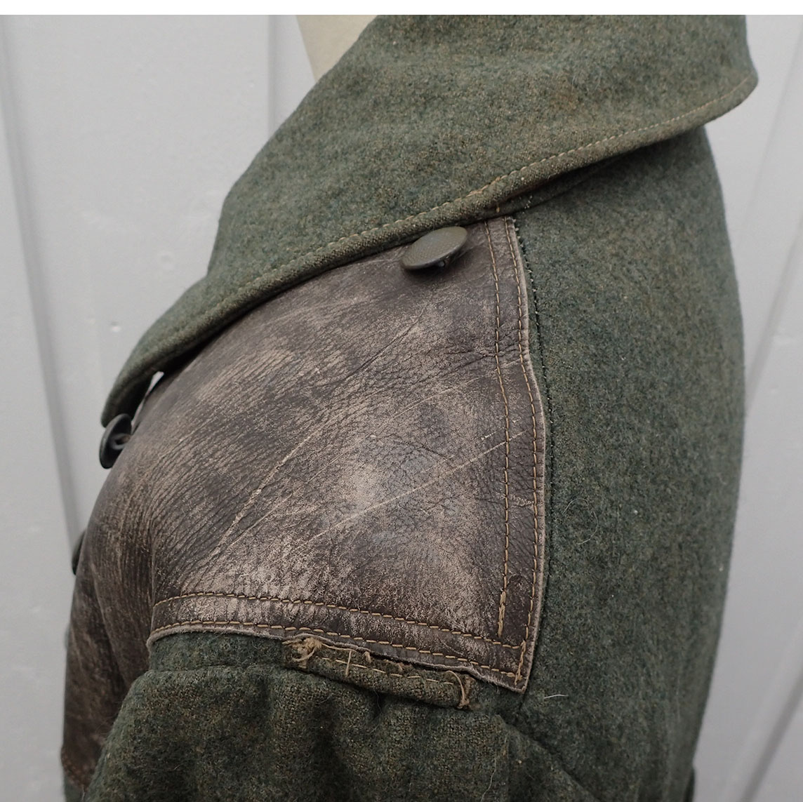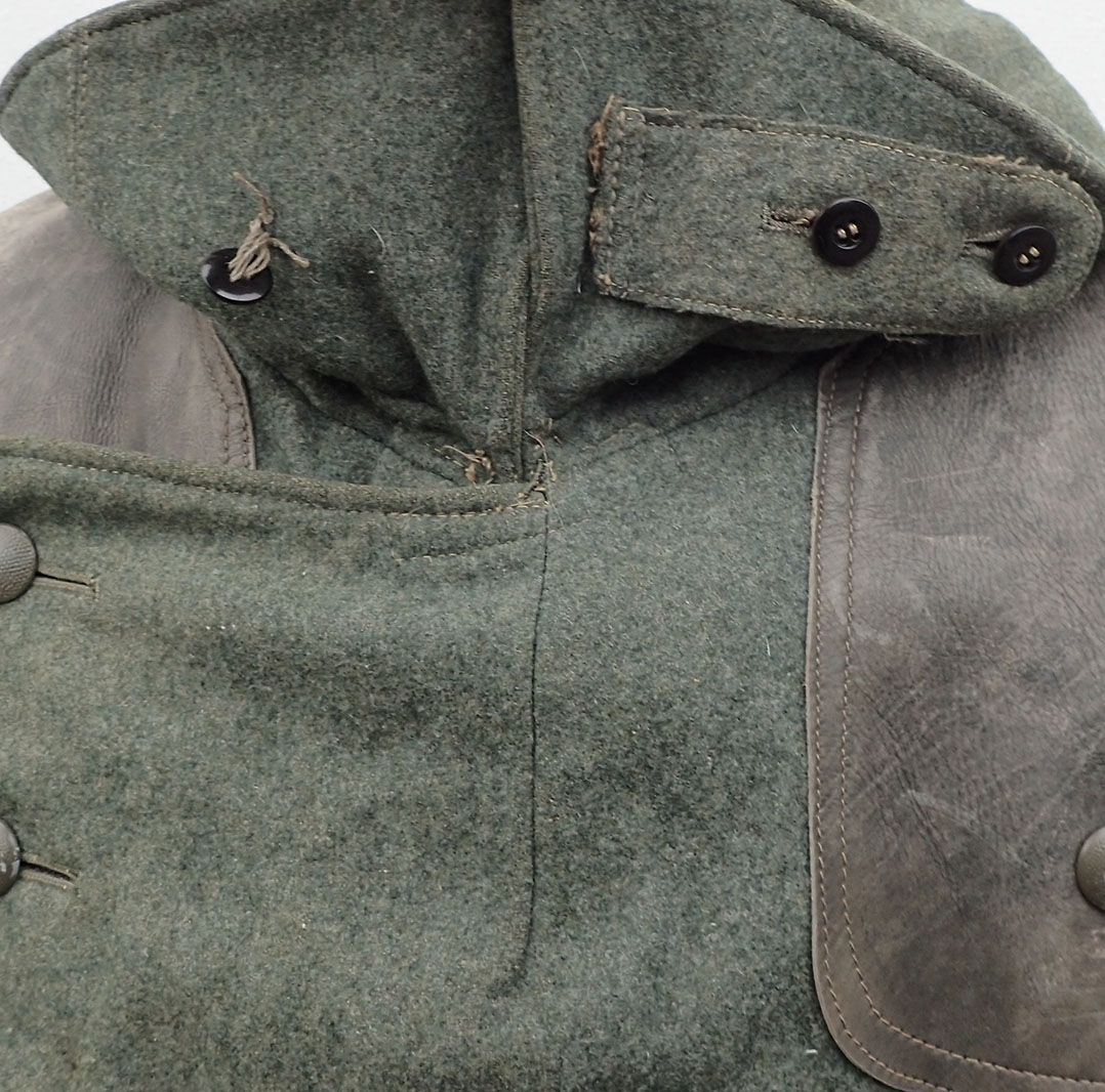 Wehrmacht/SS vaktfrakk. Sydd i grønn uniformsstoff. I fronten 12 grønnlakkerte knapper. Oppå skuldrene knapper og hemper, for å knappe på Wehrmacht eller Waffen-SS skulderklaffer. I halsen hempe i metall, for å knepper igjen halsen. Under kraven tunge og knapper, for å kneppe igjen halsen. Bak i kraven hette i beige bomull. Denne er festet med hempe med knapp. Bak på frakken er det en strammehempe med 2 knapper. Foran er det skråstilt stikklomme og vannrette lommer med lommeflapper. Oppå skuldrene er det tykk grå skinn, hvor mauserreimen skal henges over, slik at mauseren med reimen ikke gnager på skuldrene. Under armene samme grå tykk lær, hvor mauserbajonetten skal festes ned i. Fordi man ikke får brukt ett vanlig belte rundt en slik tykk frakk som denne, så skal mauserbajonetten festes under en av armene. Bak i folden alle de originale små knappene.