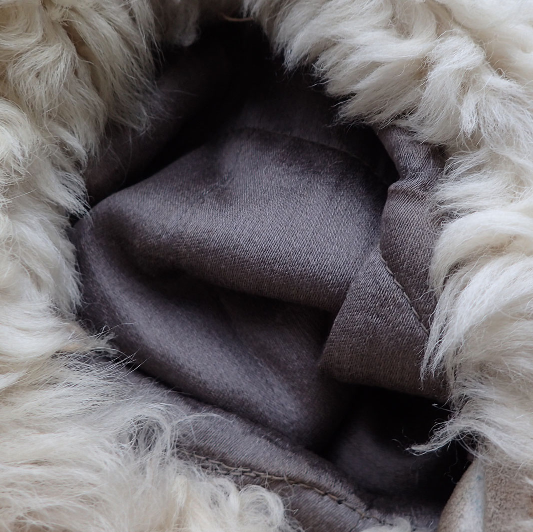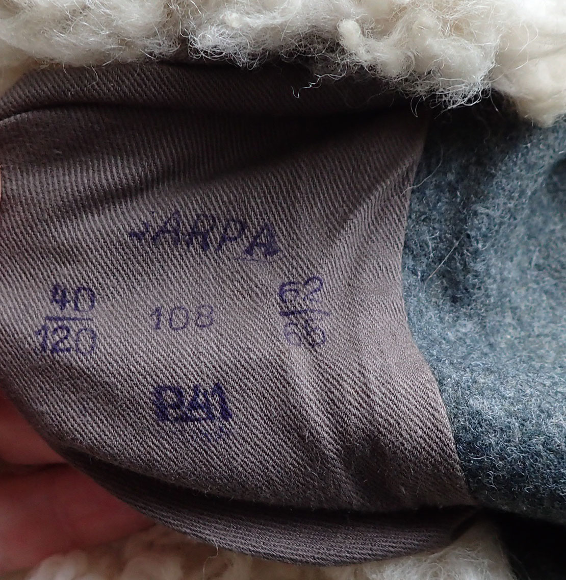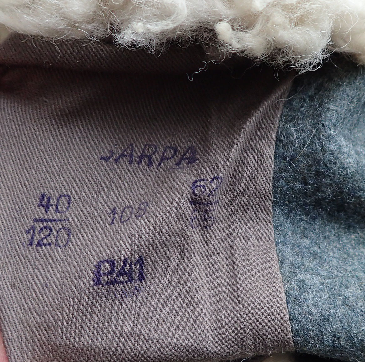 Innvendig med hvit tykk saueskinn. Midt på med en tunge i stoff med knapp på, for å feste på motsatt side. Med grå bomullsfòr i armene. Inne i innerlommen stemplet med produsenten SARPA. Under med 5-bokstavs koden og under der igjen P. 41 (Potsdam 1941).